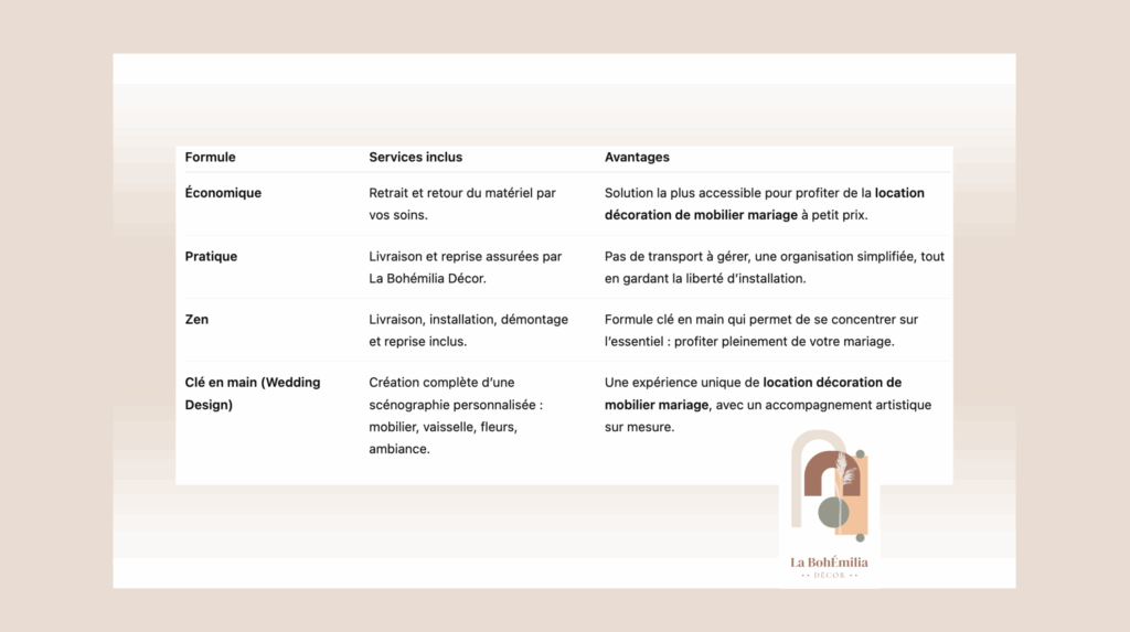 Cette formule vous permet une grande autonomie et une totale liberté d’organisation, tout en bénéficiant de la qualité et du style des collections proposées par La Bohémilia Décor.