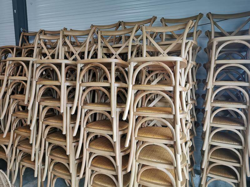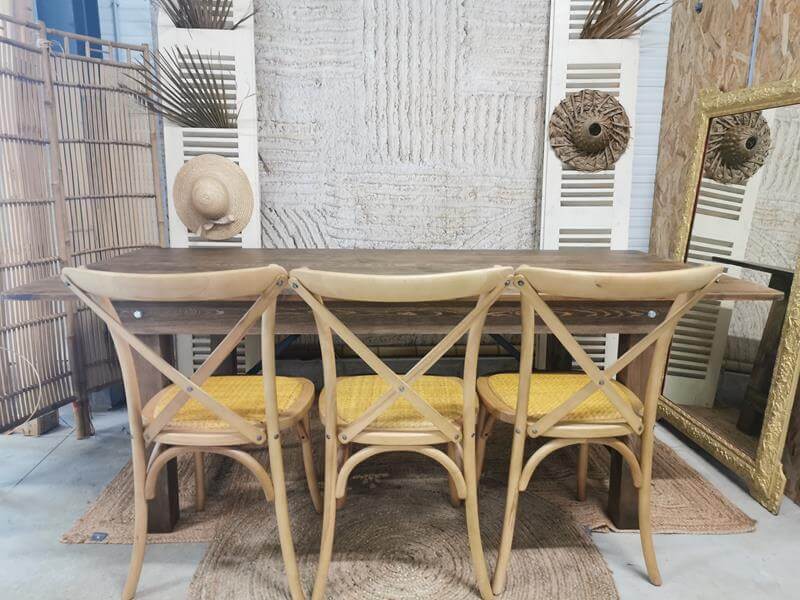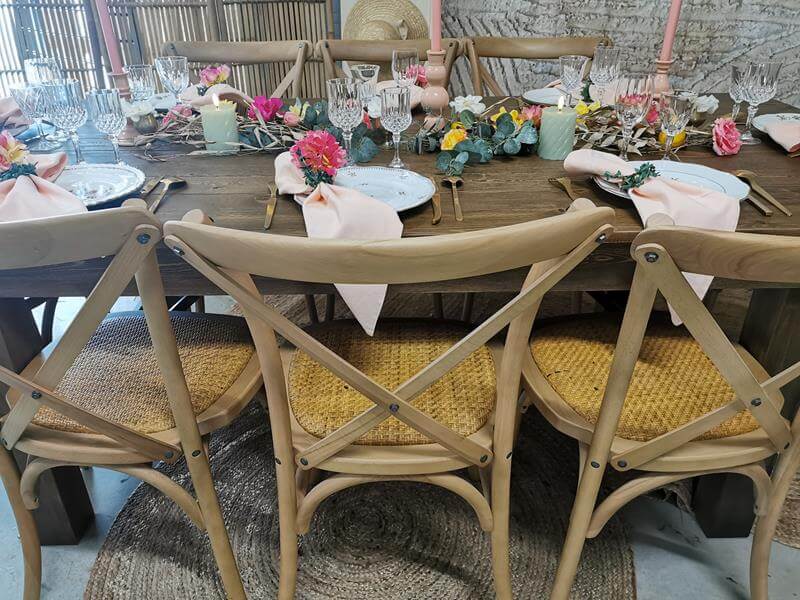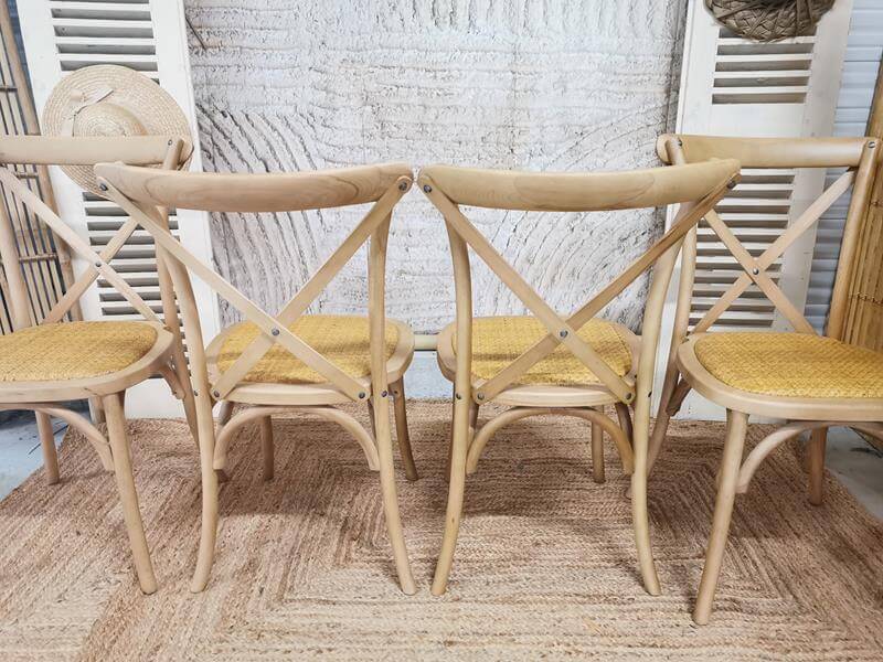 La Bohémilia est fière de vous proposer la location de ses chaises « Aline » au dos croisé en bois . »Aline » en bois naturel apportera une touche champêtre et bohème à votre décoration. Idéale pour tous vos évènements, qu’il s’agisse de séminaires, de mariages ou de réceptions.
