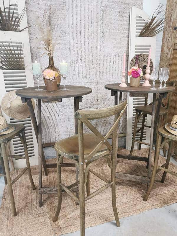 Le mange debout bois rustique est la table haute incontournable des évènements champêtres et des buffets originaux et authentiques. Entouré de nos chaises bistro de bar par exemple, il transformera vos espaces de réception en lieux de convivialité.