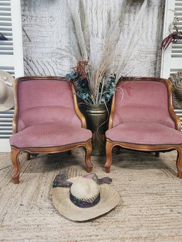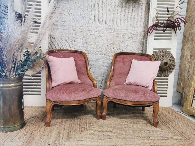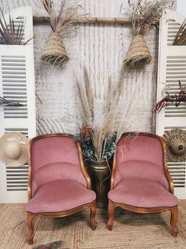 Coup de cœur pour ces fauteuils rose vieillis. Romantiques et élégants, ils pourront être votre assise de cérémonie ou disposés près de votre table avec l’urne et le livre d’or par exemple. Ils peuvent également assurer une assise confortable à vos invités dans la scénographie de votre cocktail.