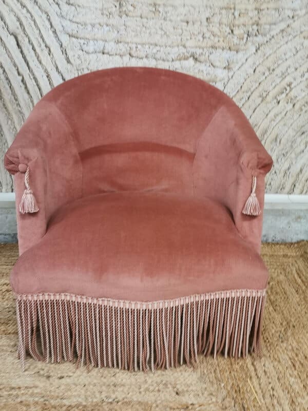Authentique fauteuil crapaud rose poudré qui s’intègrera parfaitement dans votre scénographie de cocktail pour assurer une assise confortable et distinguée à vos invités ou idéale pour les mariés lors de la cérémonie laïque.