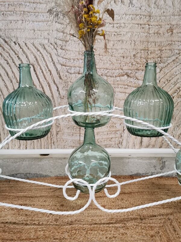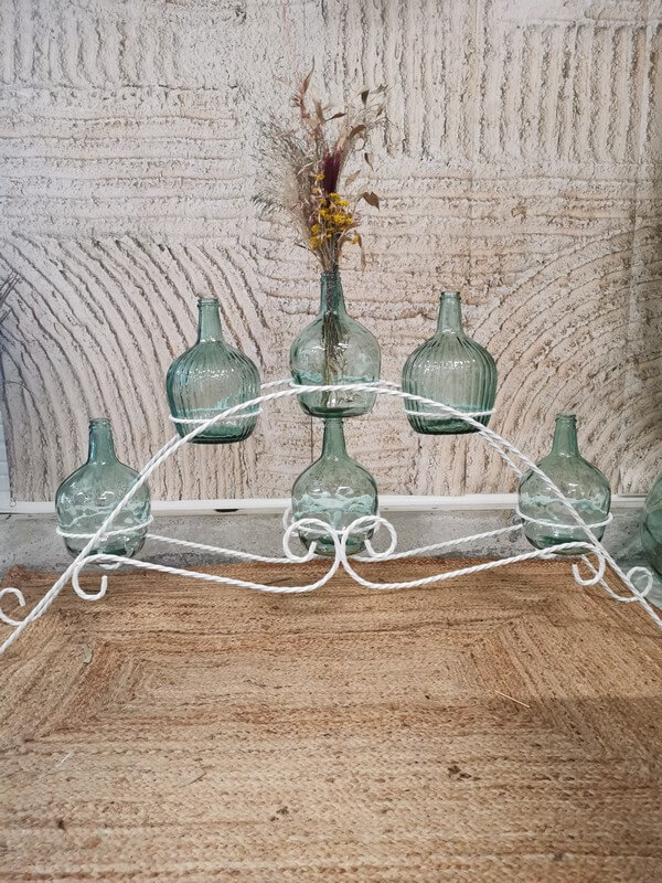 Un porte-plantes en fer forgé blanc pour sublimer un espace, utiliser en support plan de table avec des dames jeannes.