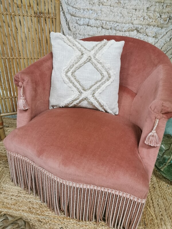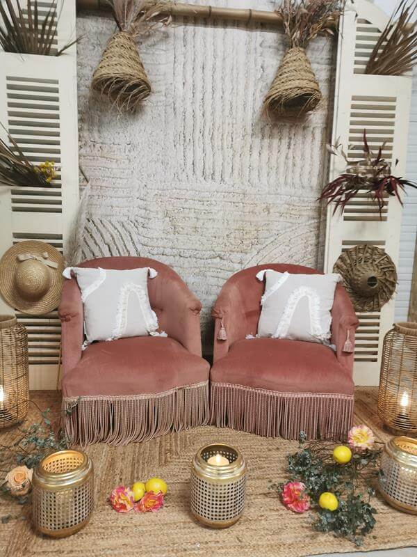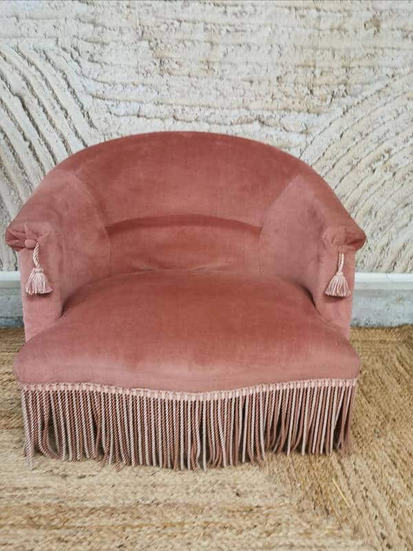 Authentique fauteuil crapaud rose poudré qui s’intègrera parfaitement dans votre scénographie de cocktail pour assurer une assise confortable et distinguée à vos invités ou idéale pour les mariés lors de la cérémonie laïque.