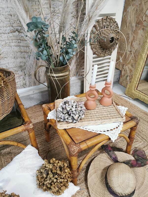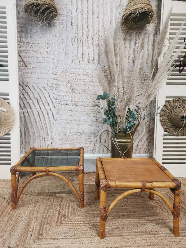 Authentiques tables basses en rotin, raffinées et idéales pour mettre en valeur vos décorations.