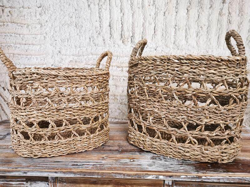 Deux grands panières en jonc de mer ,idéales dans une ambiance bohème bucolique ou romance ou bord de mer .